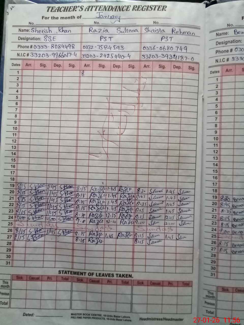 | CNIC | Full Name | Designation | R/C | Absence During Last Calender Month |