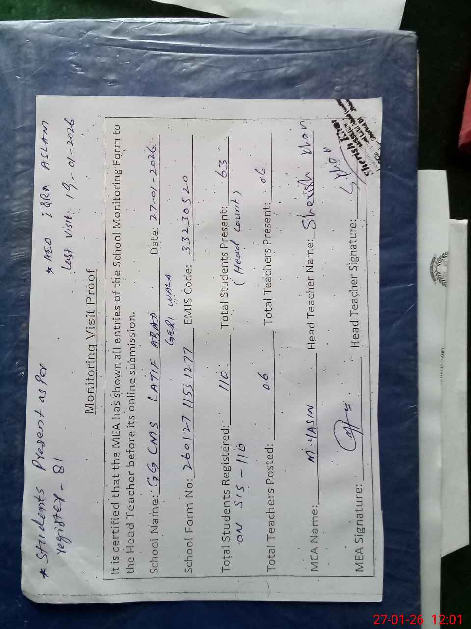 | Attendance Register | Head Teacher | MEA with School | Visit Proof |