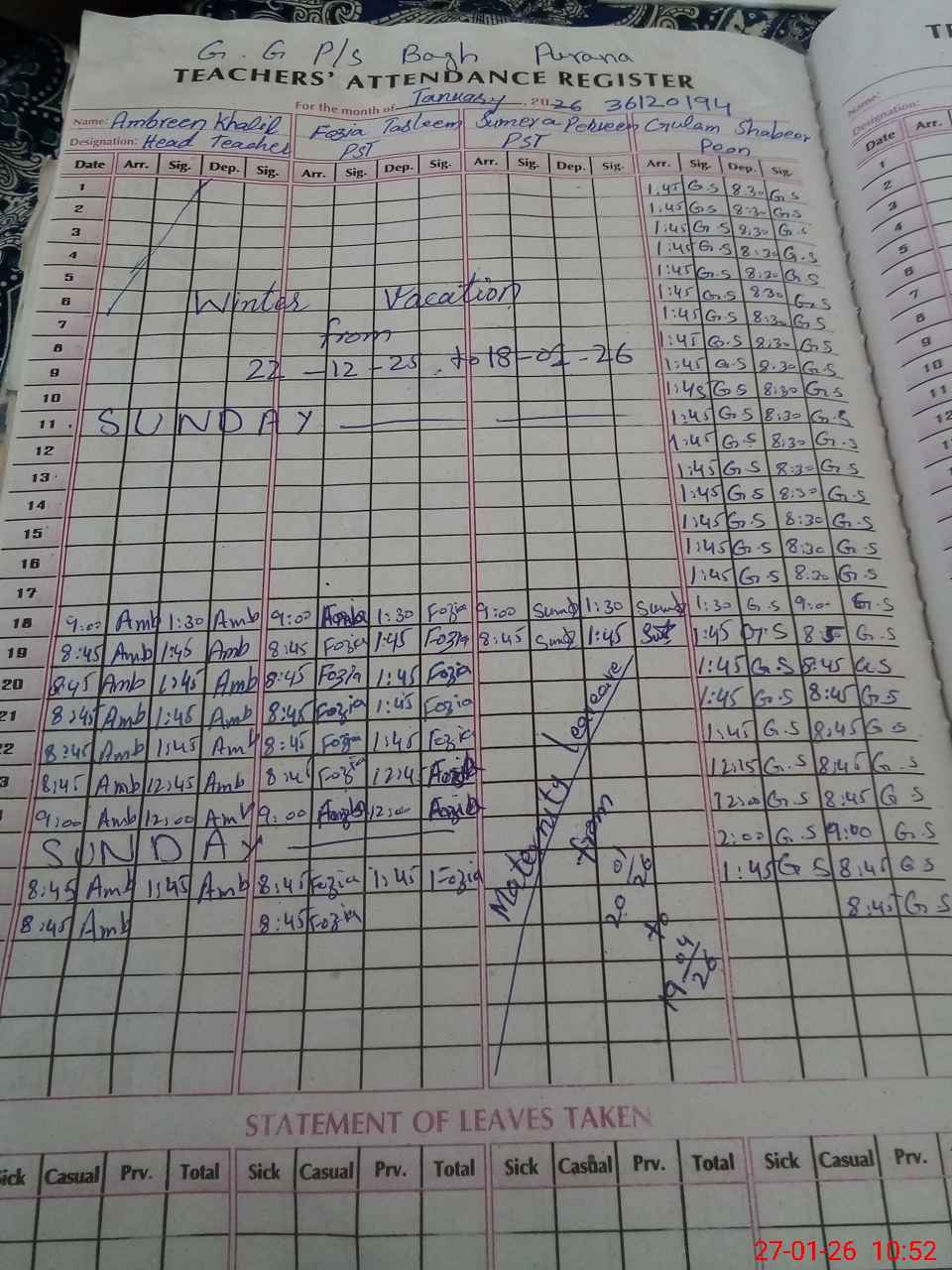 | 36**** | Su**** Pa**** | ESE Arts | Contract | 0 | 0 | 0 | 0 | 0 | 0 | 0 | 0 | 0 | Maternity |