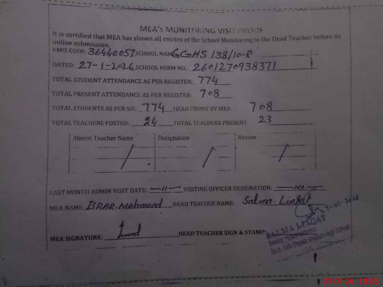 | Attendance Register | Head Teacher | MEA with School | Visit Proof |