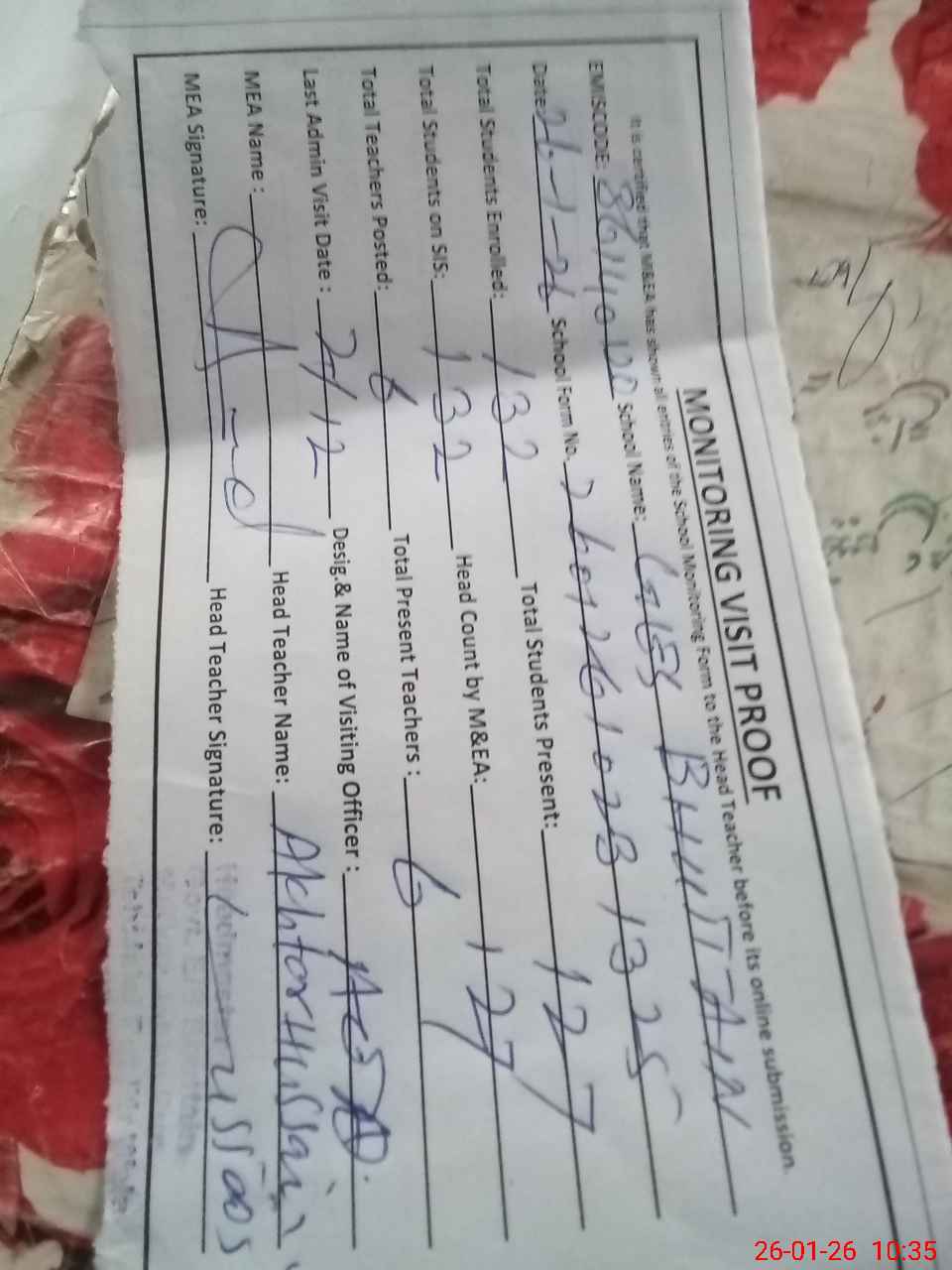 | Attendance Register | Head Teacher | MEA with School | Visit Proof |