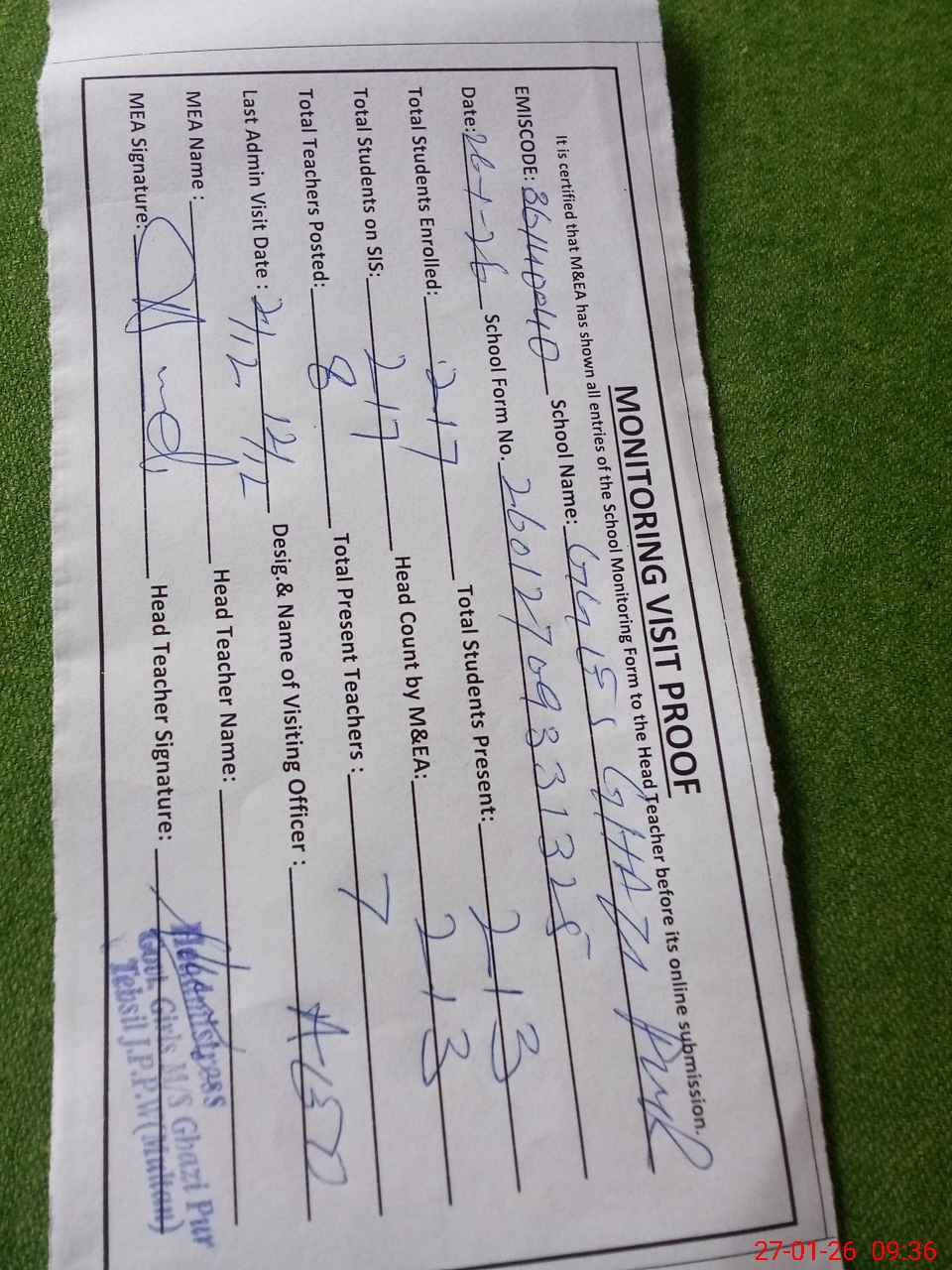 | Attendance Register | Head Teacher | MEA with School | Visit Proof |