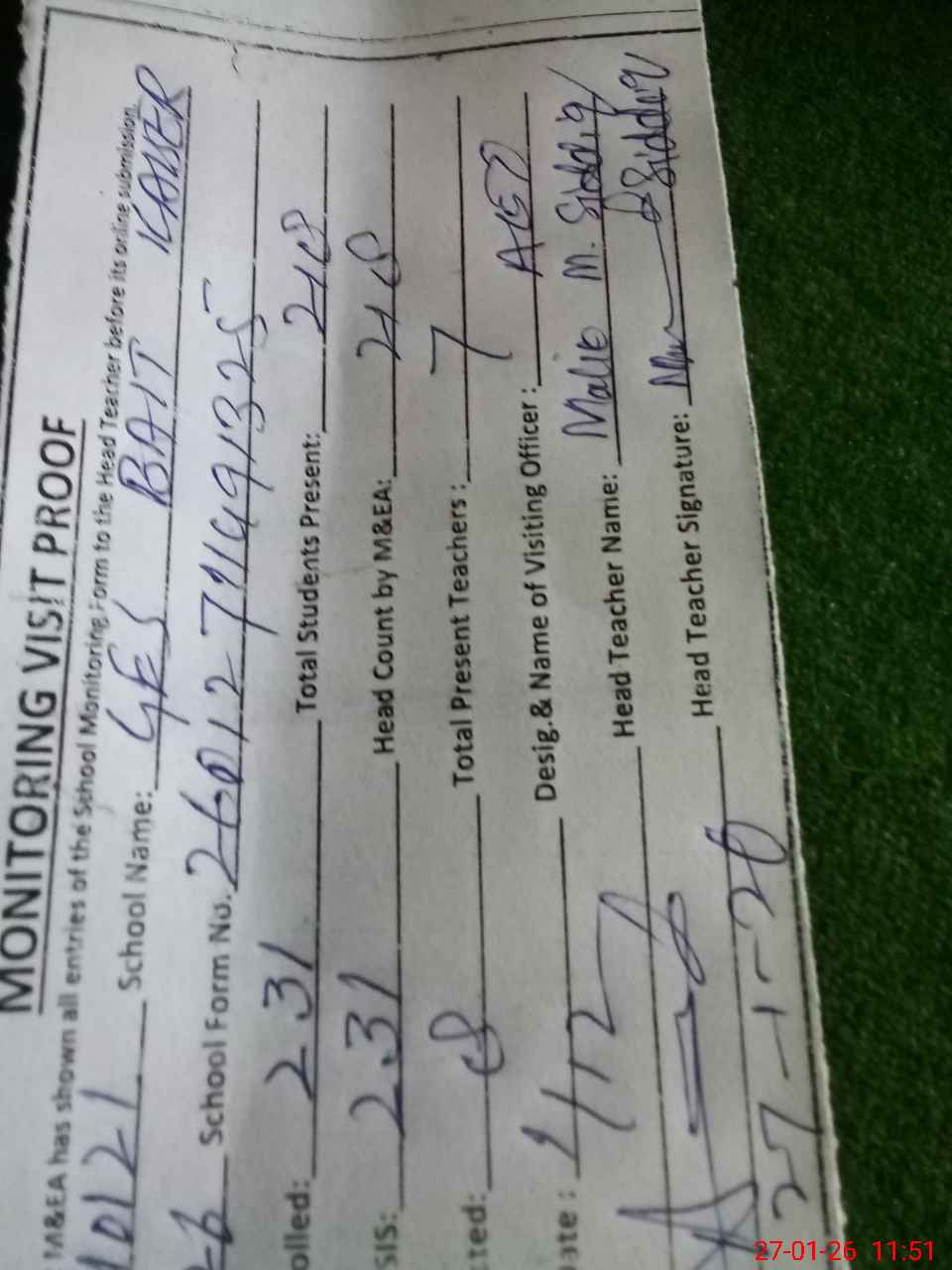 | Attendance Register | Head Teacher | MEA with School | Visit Proof |