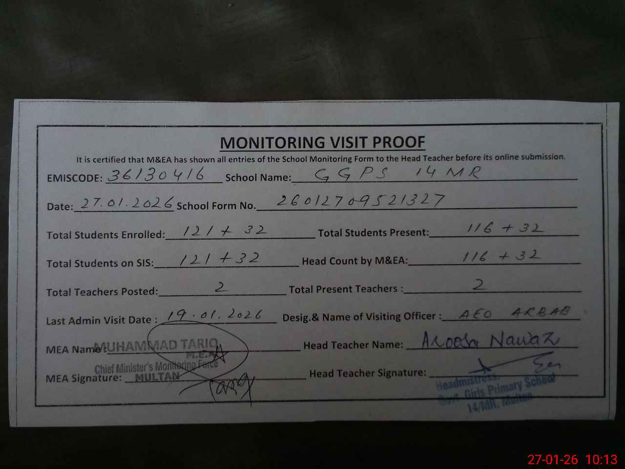 | Attendance Register | Head Teacher | MEA with School | Visit Proof |