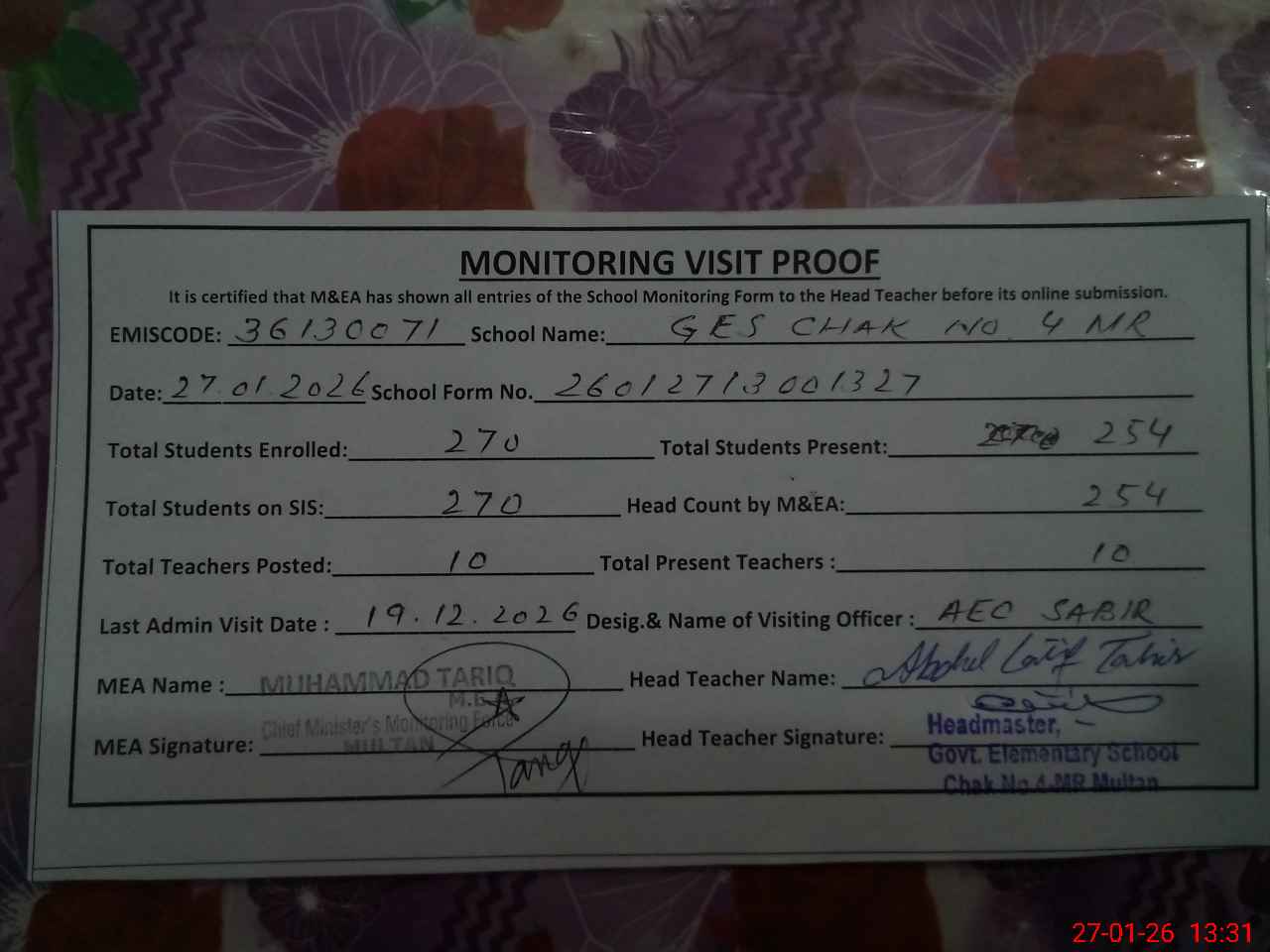 | EMIS Code: 36130071 | Name of School: GES CHAK NO 4-MR P/O MAKHDOOM RASHEED | |||