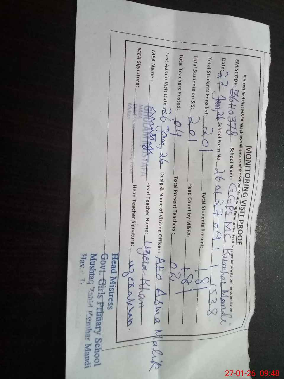 | Attendance Register | Head Teacher | MEA with School | Visit Proof |
