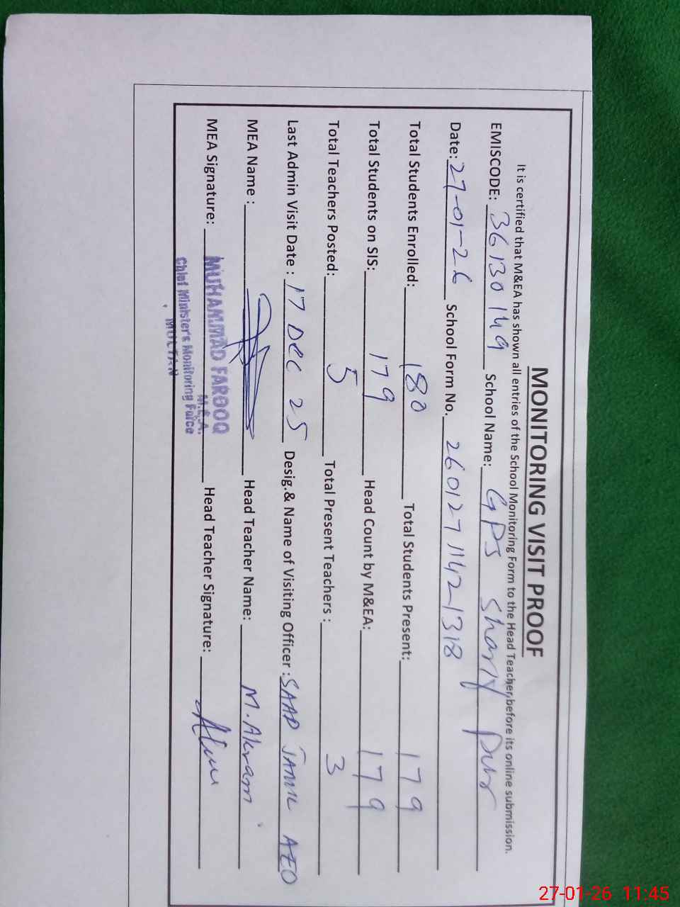 | EMIS Code: 36130149 | Name of School: GPS SHARIF PUR NAWAB PUR MULTAN | |||