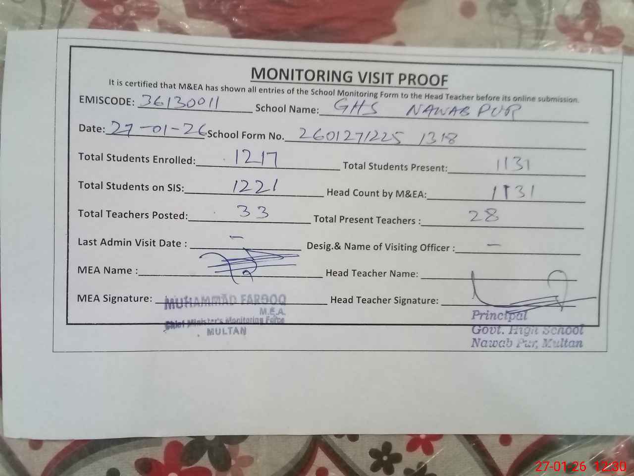 | EMIS Code: 36130011 | Name of School: GHS NAWAB PUR MULTAN | |||