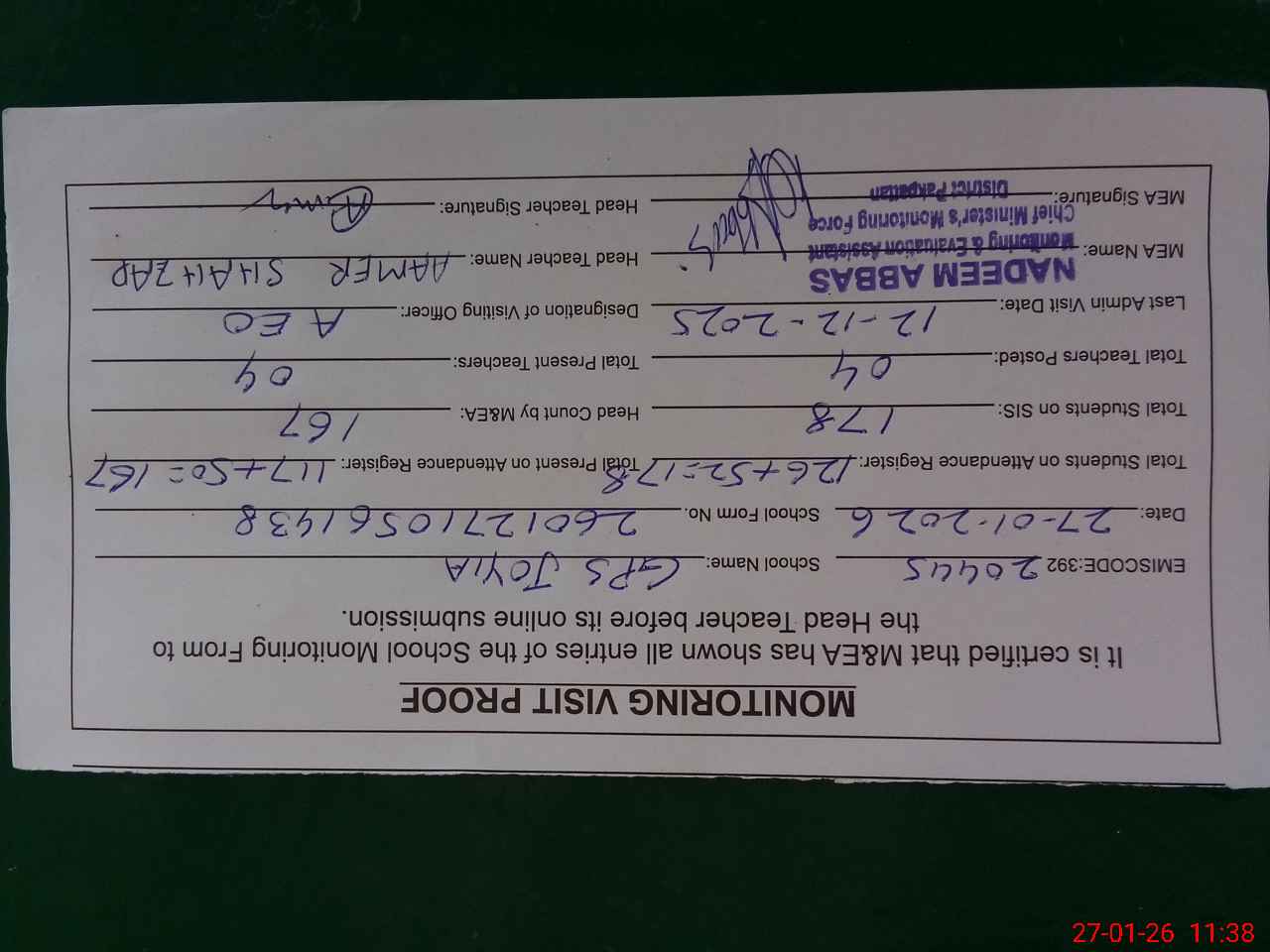 | Attendance Register | Head Teacher | MEA with School | Visit Proof |