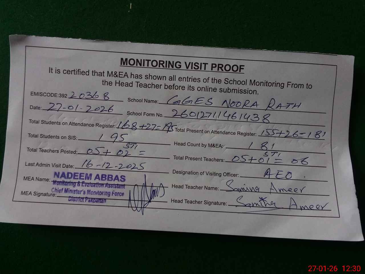 | Attendance Register | Head Teacher | MEA with School | Visit Proof |