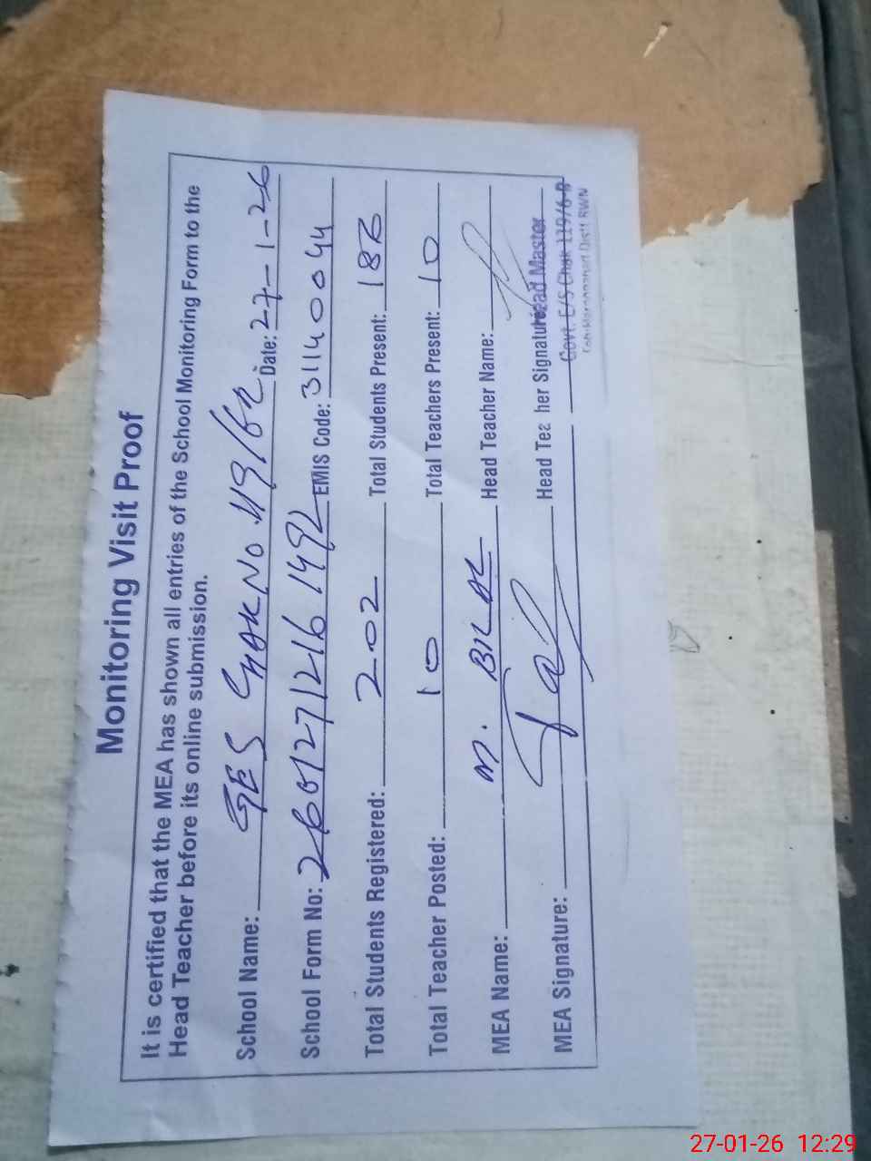 | Attendance Register | Head Teacher | MEA with School | Visit Proof |