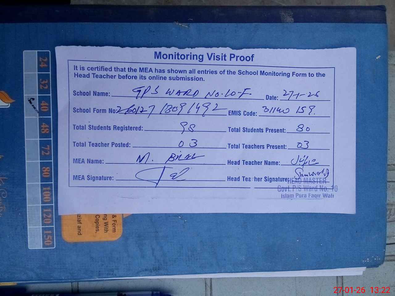 | Attendance Register | Head Teacher | MEA with School | Visit Proof |