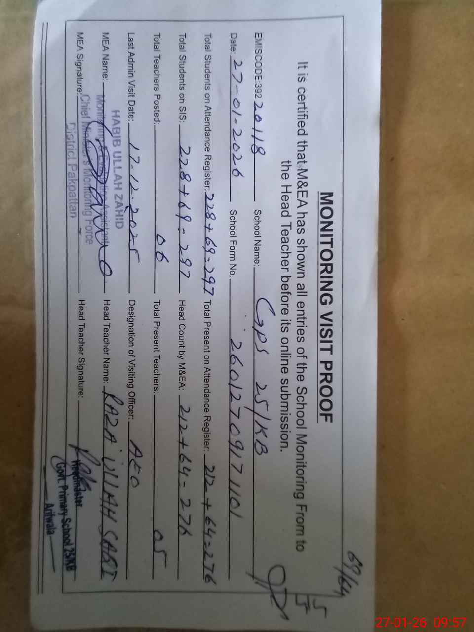 | Attendance Register | Head Teacher | MEA with School | Visit Proof |