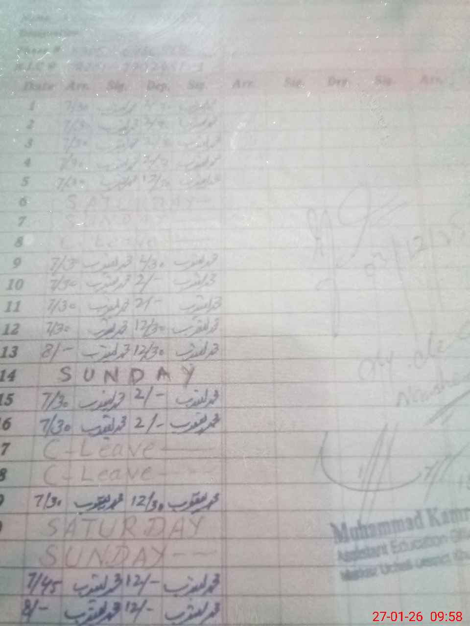 | CNIC | Full Name | Designation | R/C | Absence During Last Calender Month |