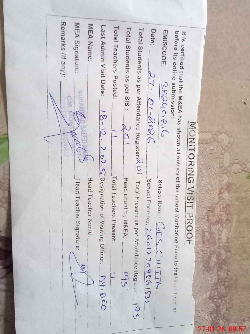 | Remarks (Use Separate Page if Required): students on SIS Qty 201 Last admin visit On 18 December 2025 by Dy.DEO | |||||