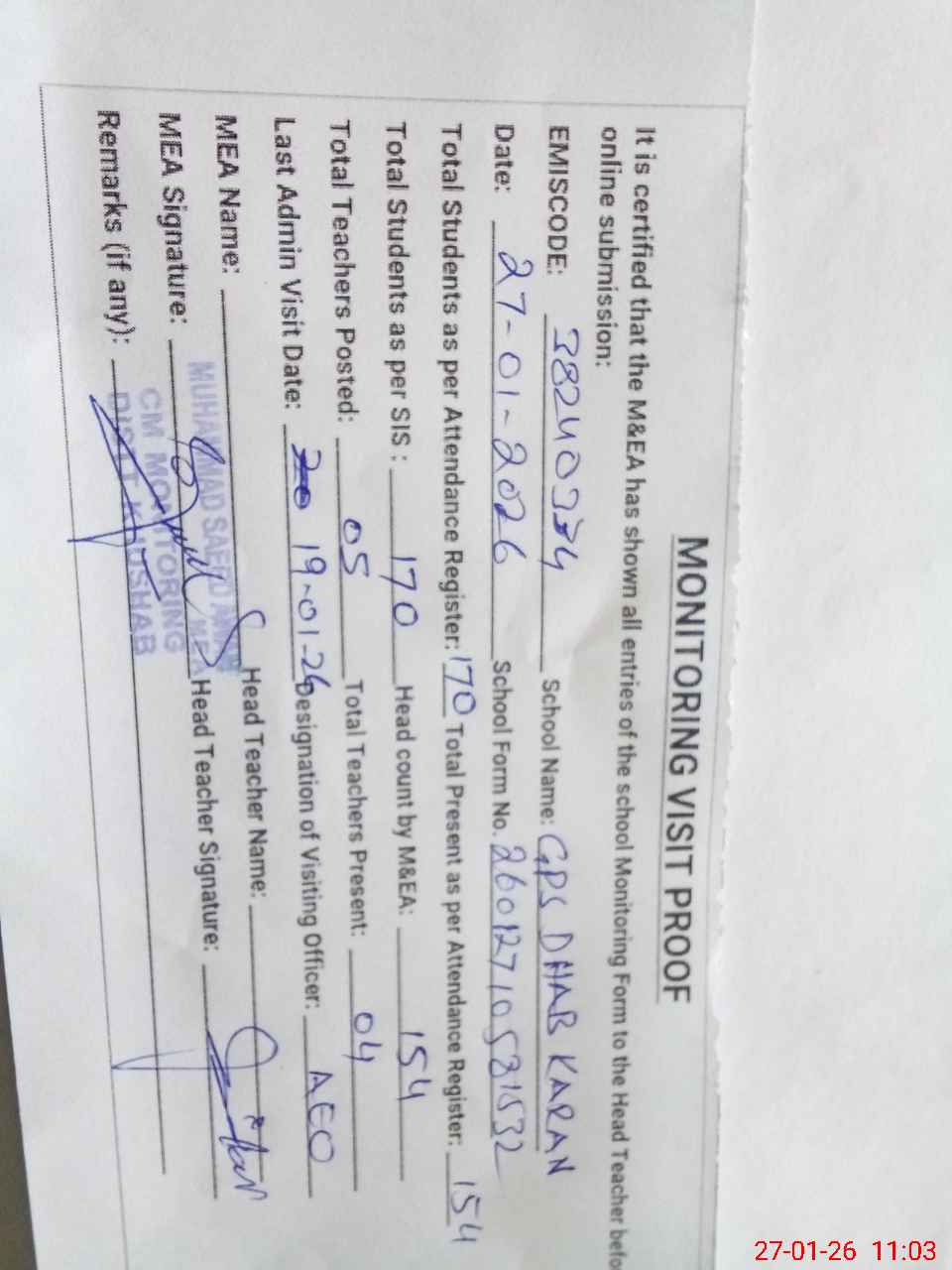 | EMIS Code: 38240334 | Name of School: GPS DHAB KARAN | |||