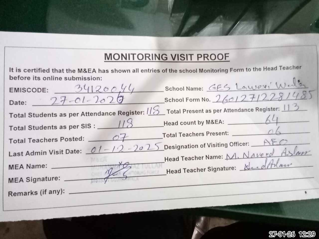 | Attendance Register | Head Teacher | MEA with School | Visit Proof |