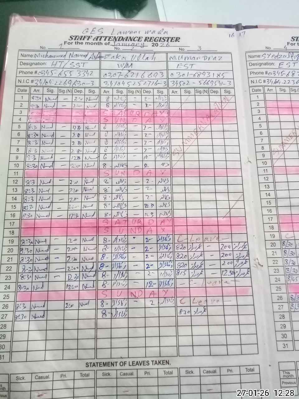 | CNIC | Full Name | Designation | R/C | Absence During Last Calender Month |