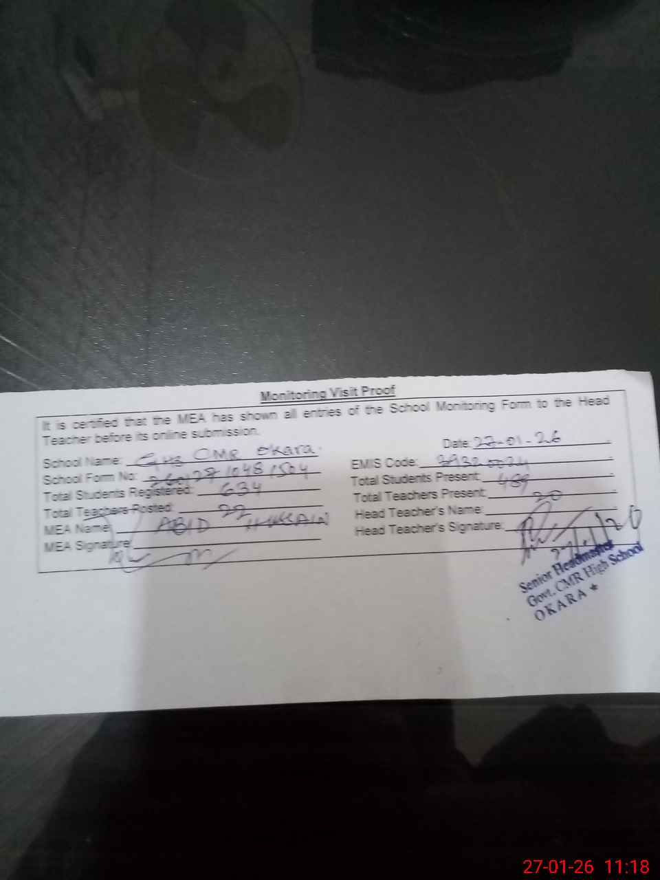 | Attendance Register | Head Teacher | MEA with School | Visit Proof |