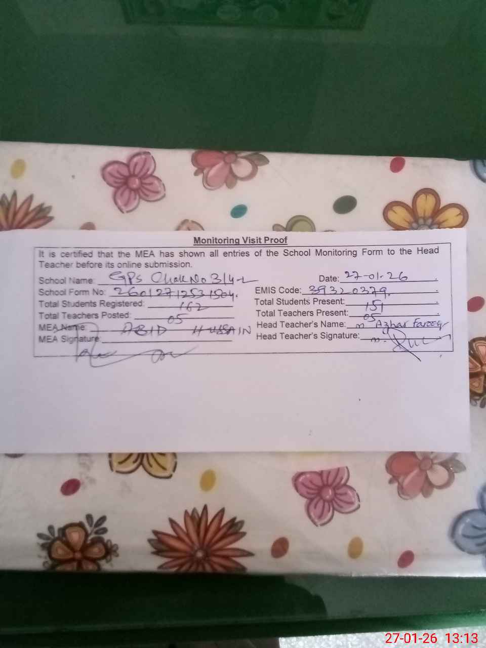 | Attendance Register | Head Teacher | MEA with School | Visit Proof |