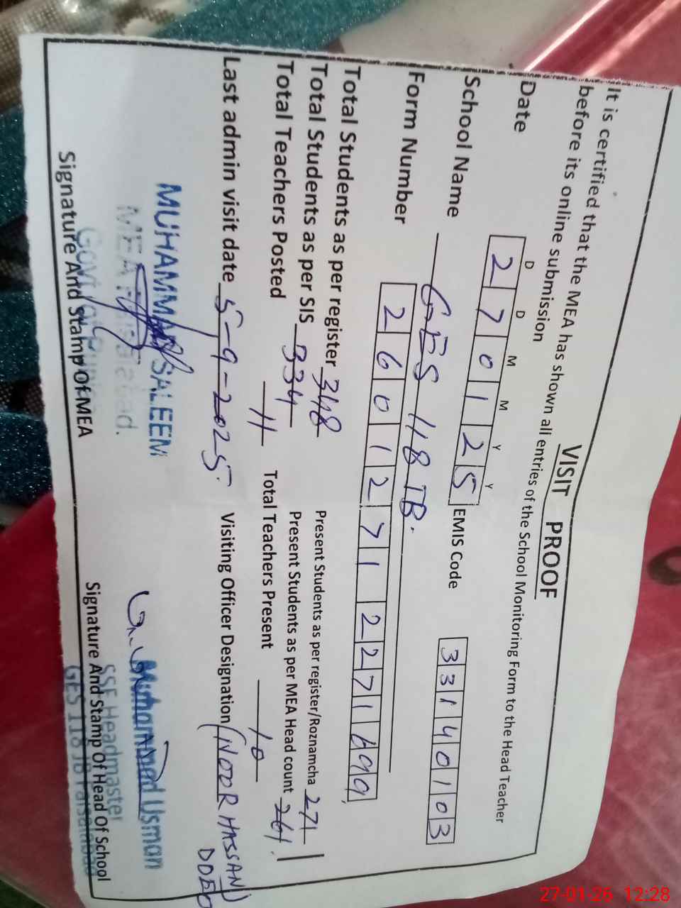 | Attendance Register | Head Teacher | MEA with School | Visit Proof |