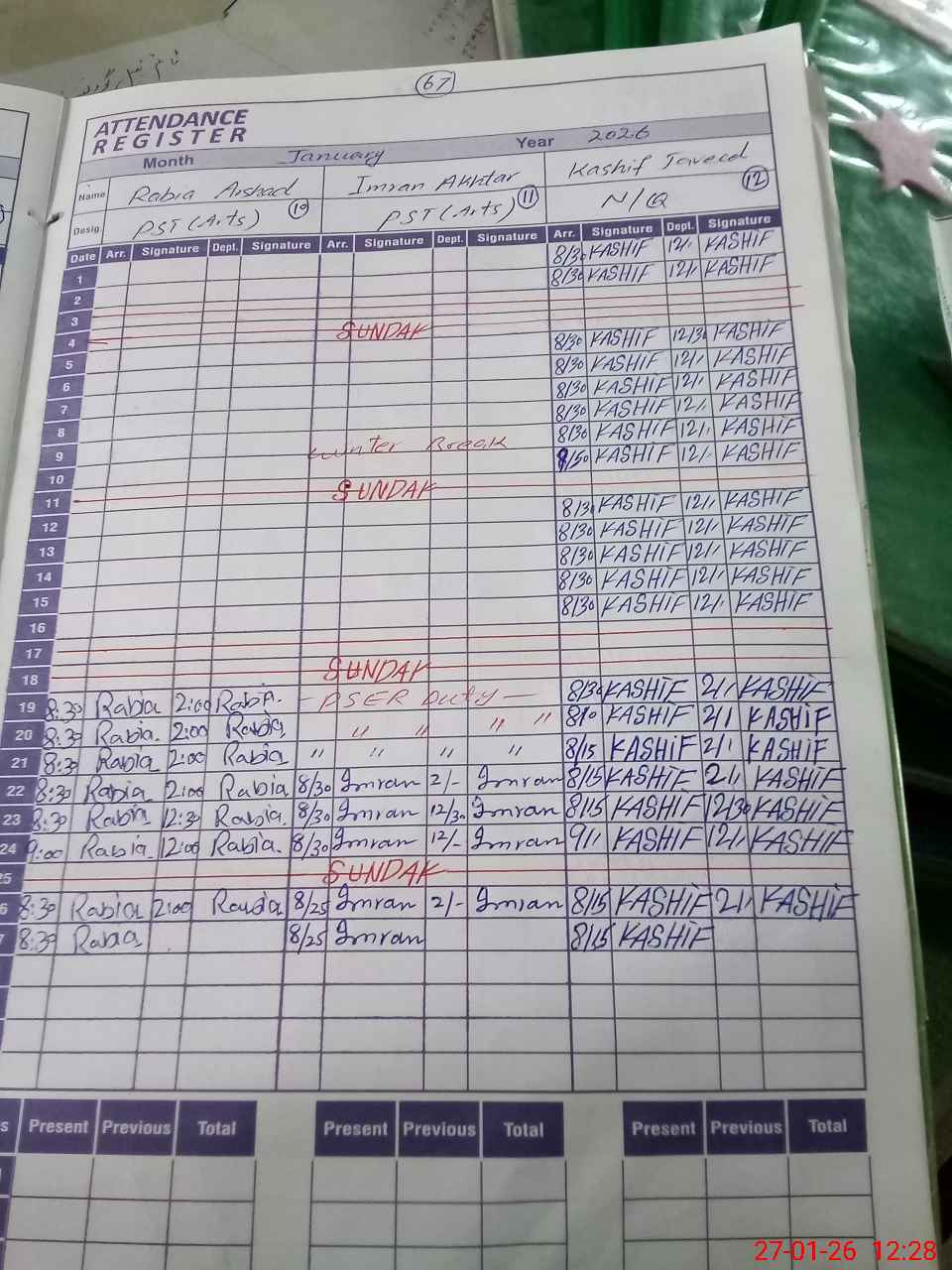 | CNIC | Full Name | Designation | R/C | Absence During Last Calender Month |