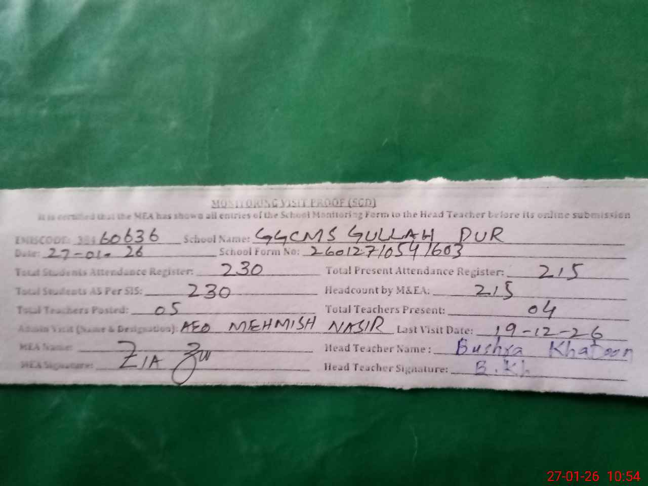 | Attendance Register | Head Teacher | MEA with School | Visit Proof |