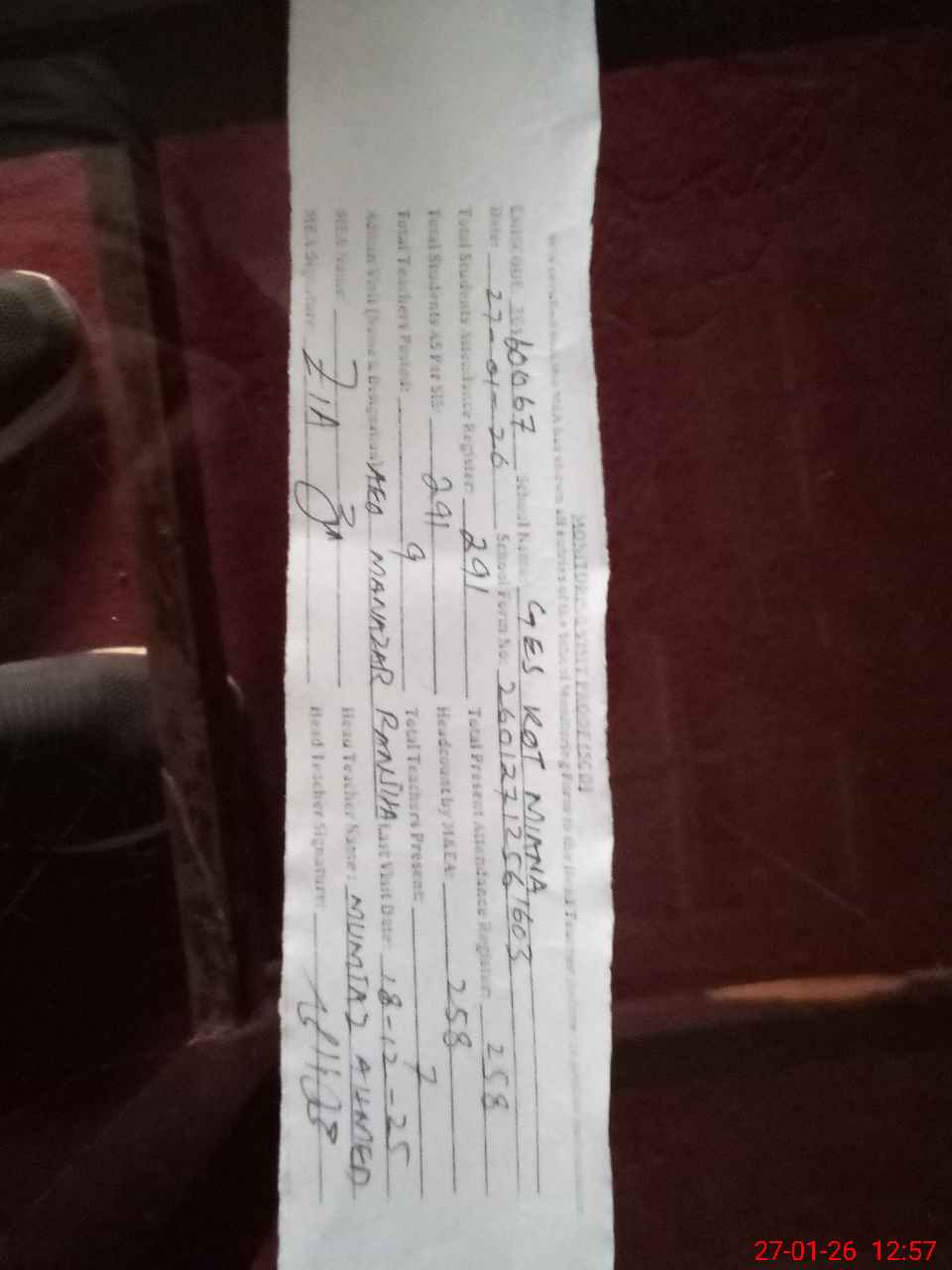 | Attendance Register | Head Teacher | MEA with School | Visit Proof |