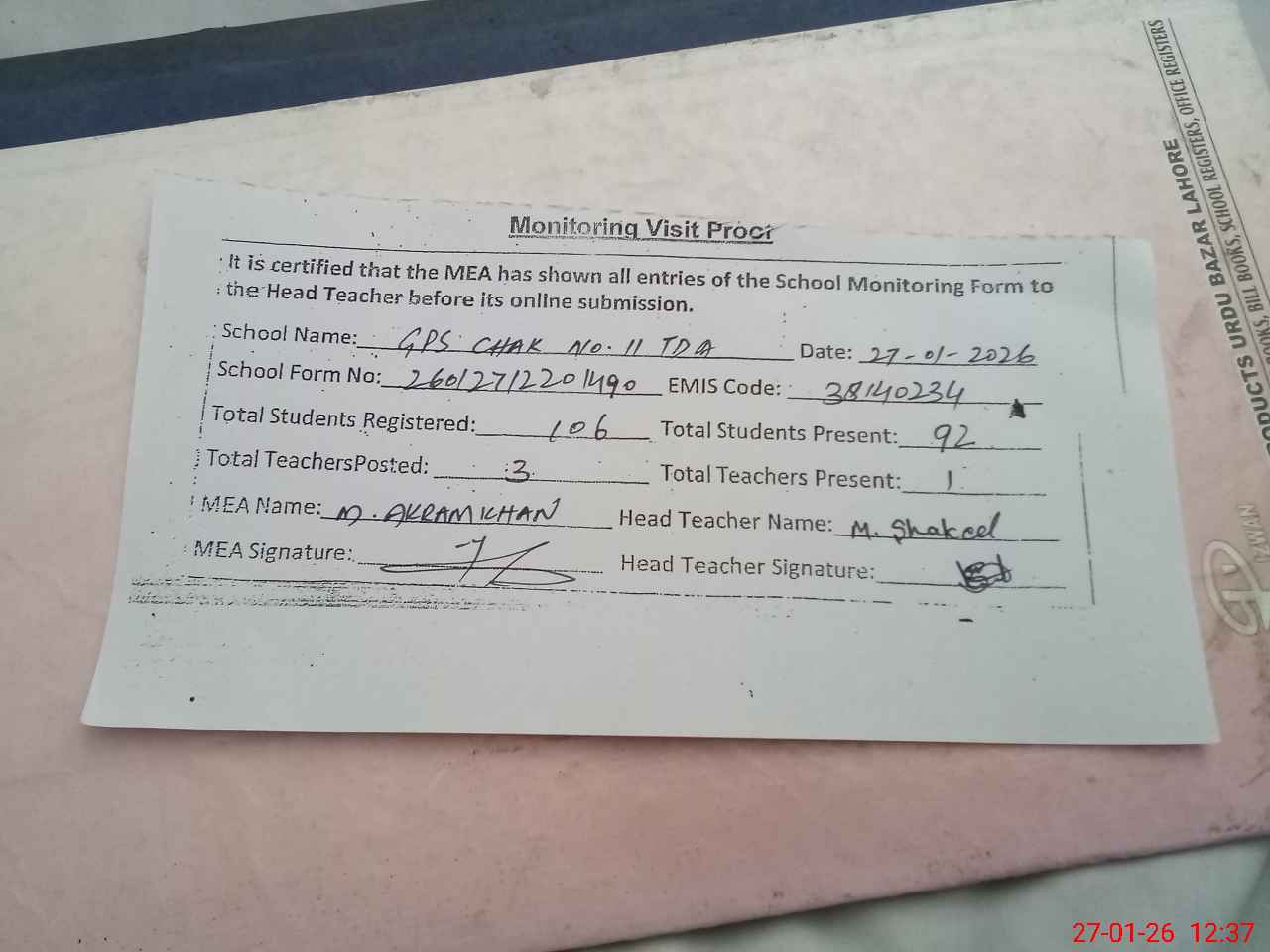 | EMIS Code: 38140234 | Name of School: GPS CHAK NO 11 TDA | |||
