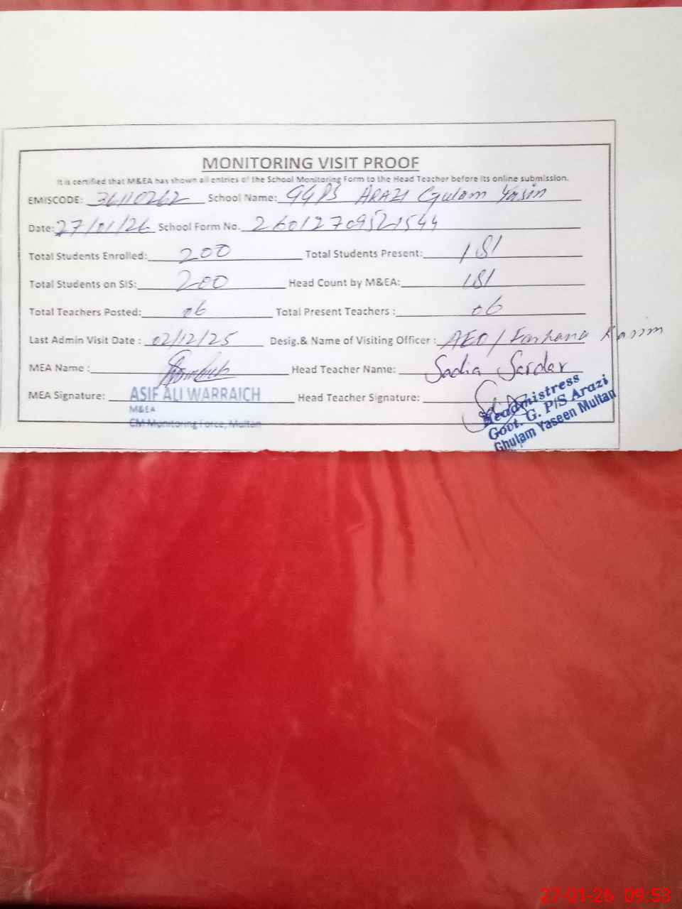 | Attendance Register | Head Teacher | MEA with School | Visit Proof |
