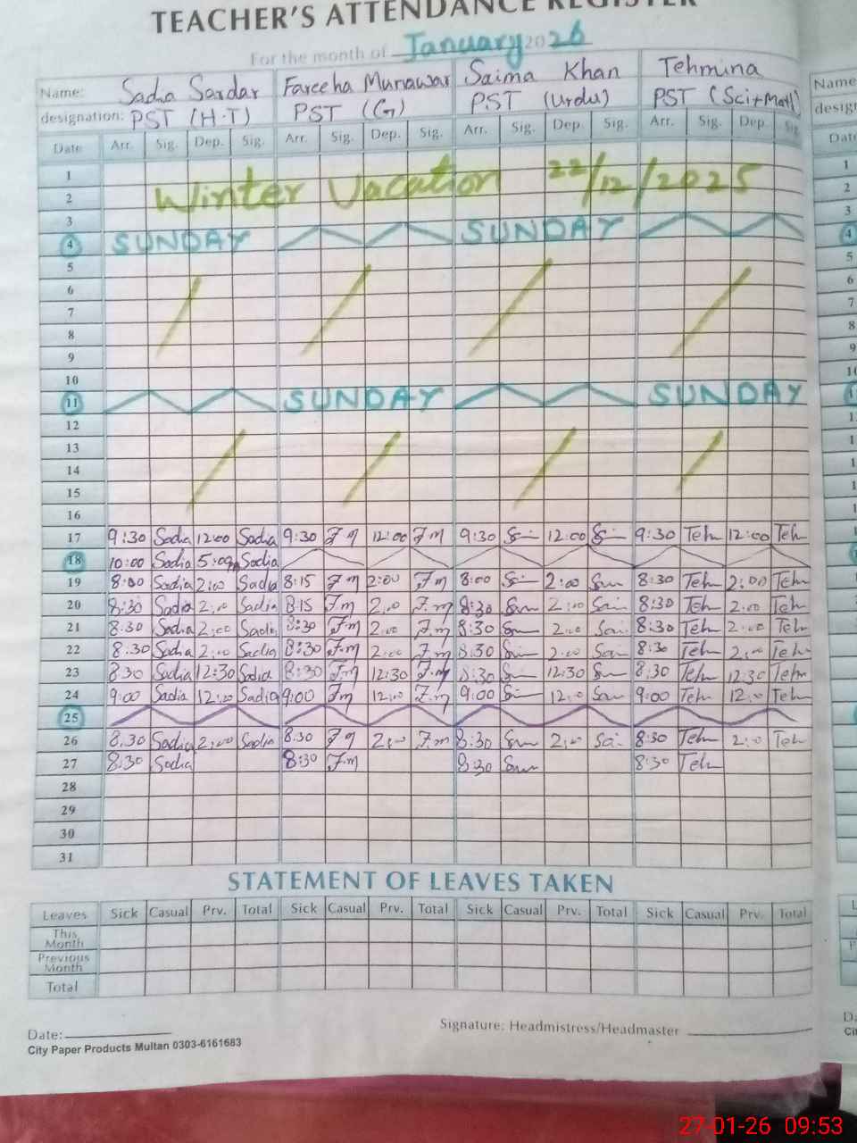 | Leave | Duty | Absent | Maternity | Medical | Ex- Pak |