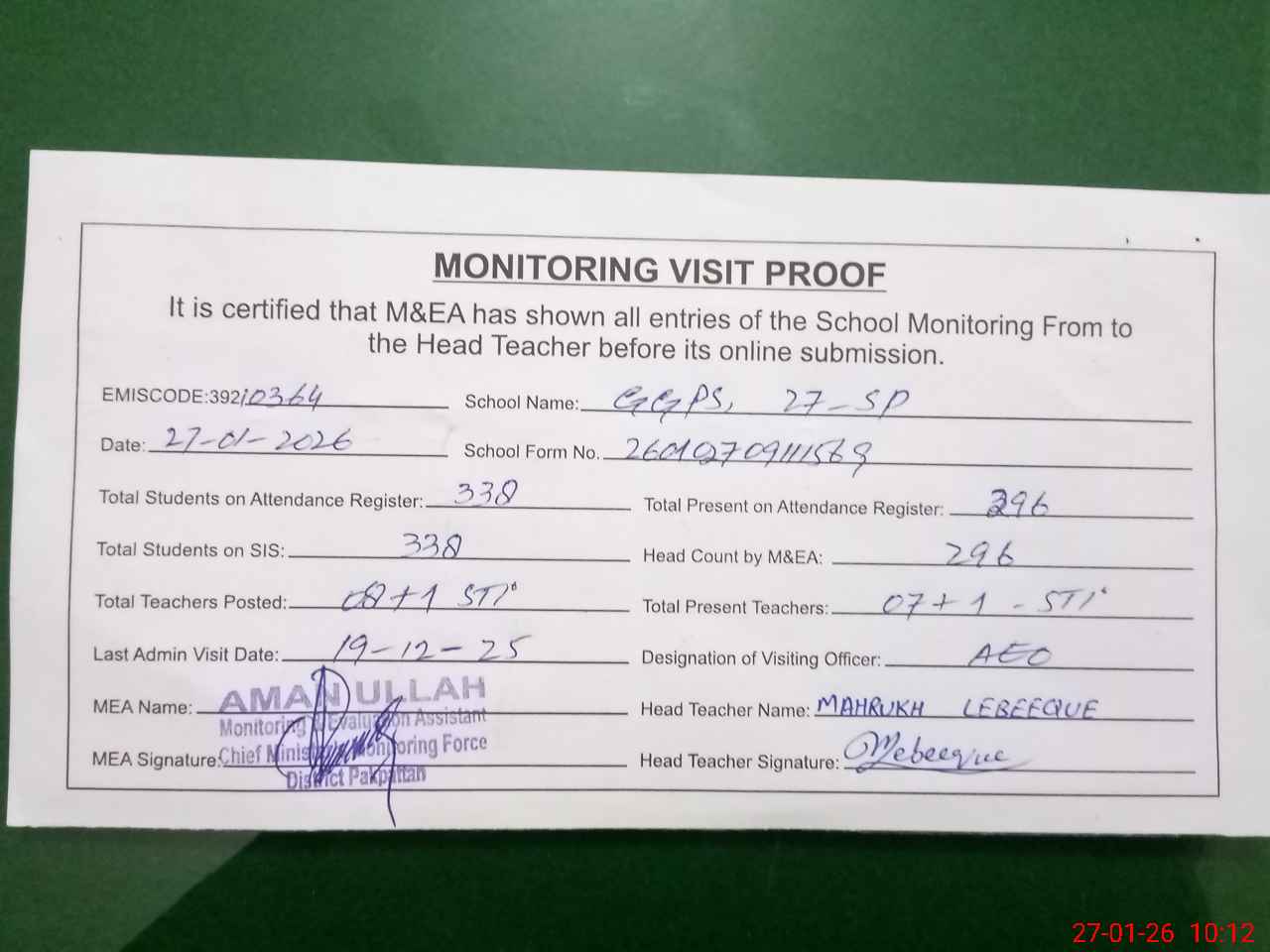 | Attendance Register | Head Teacher | MEA with School | Visit Proof |