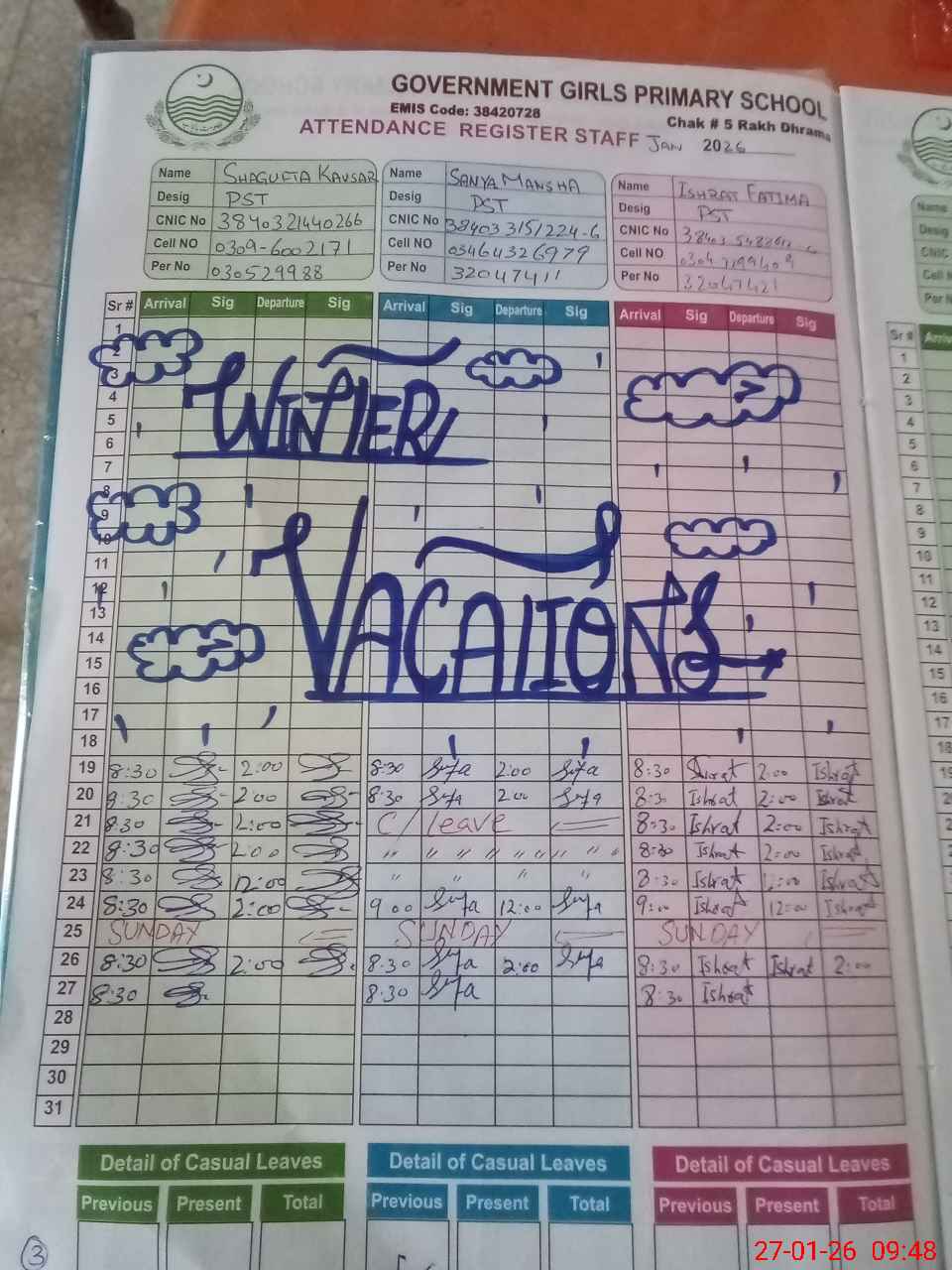 | CNIC | Full Name | Designation | R/C | Absence During Last Calender Month |