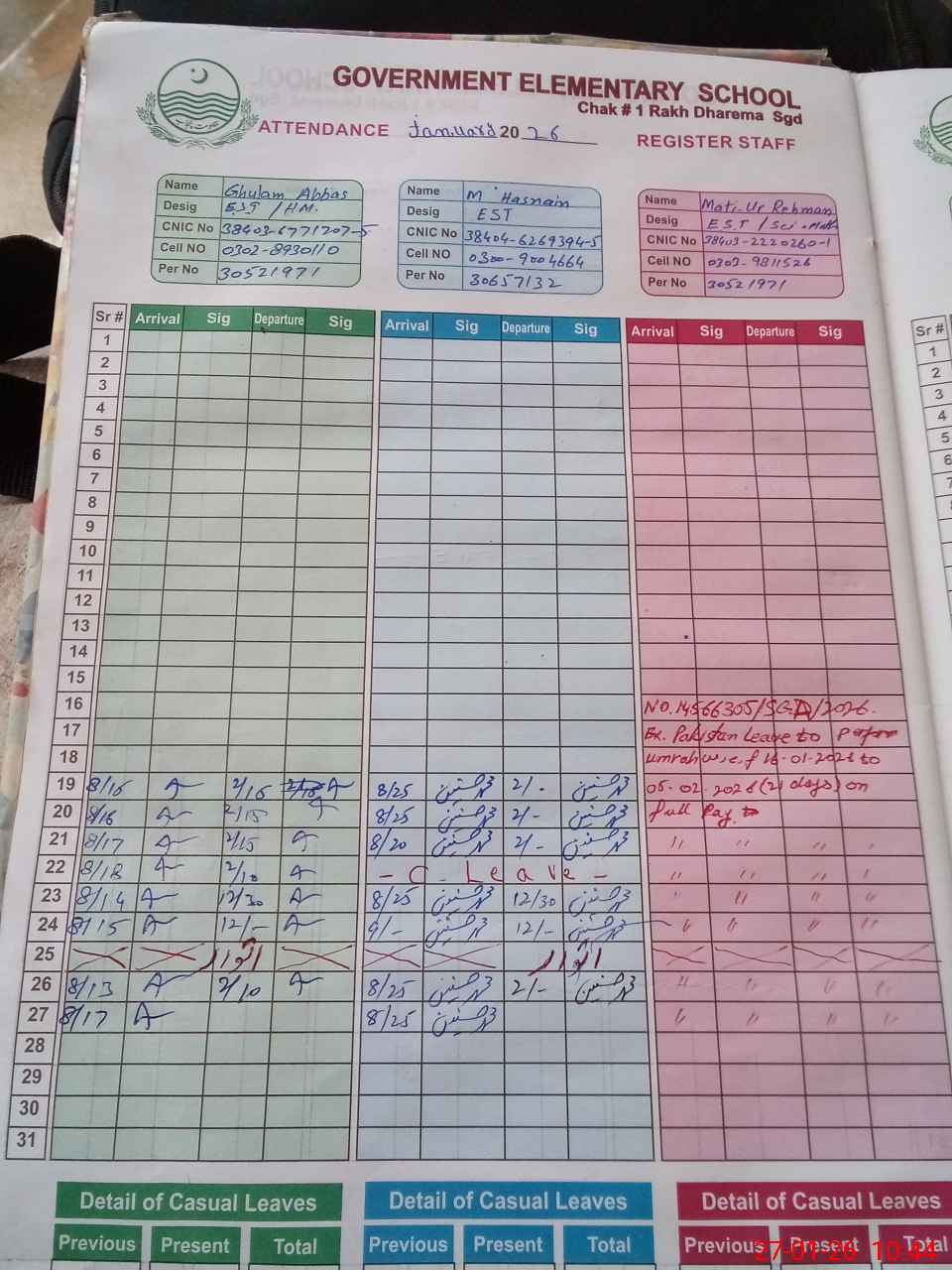 | CNIC | Full Name | Designation | R/C | Absence During Last Calender Month |