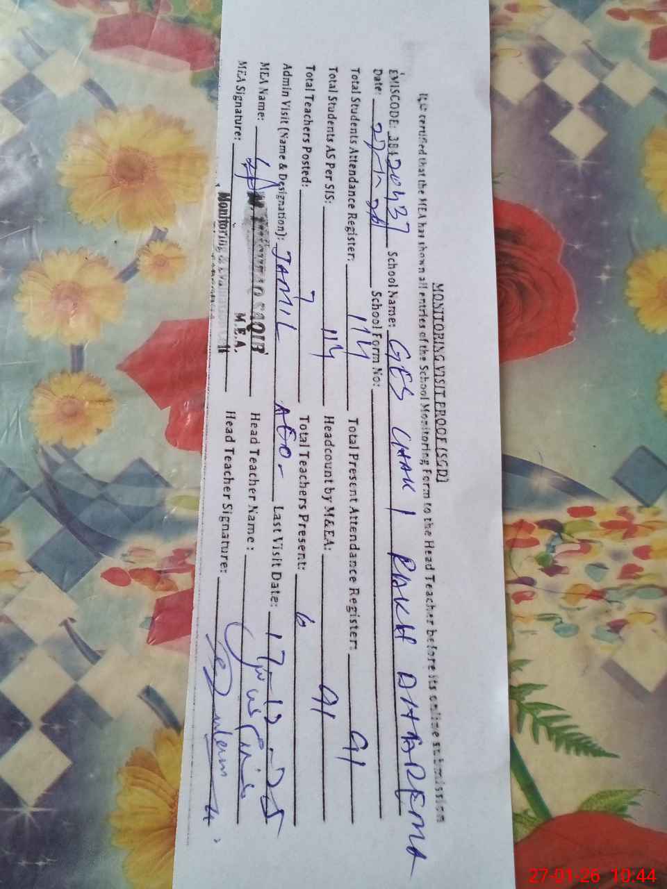 | Attendance Register | Head Teacher | MEA with School | Visit Proof |