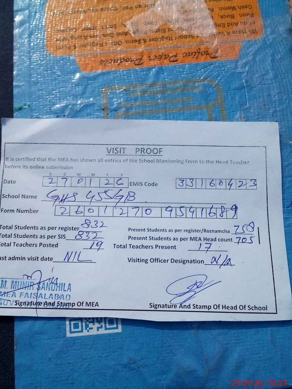 | Attendance Register | Head Teacher | MEA with School | Visit Proof |