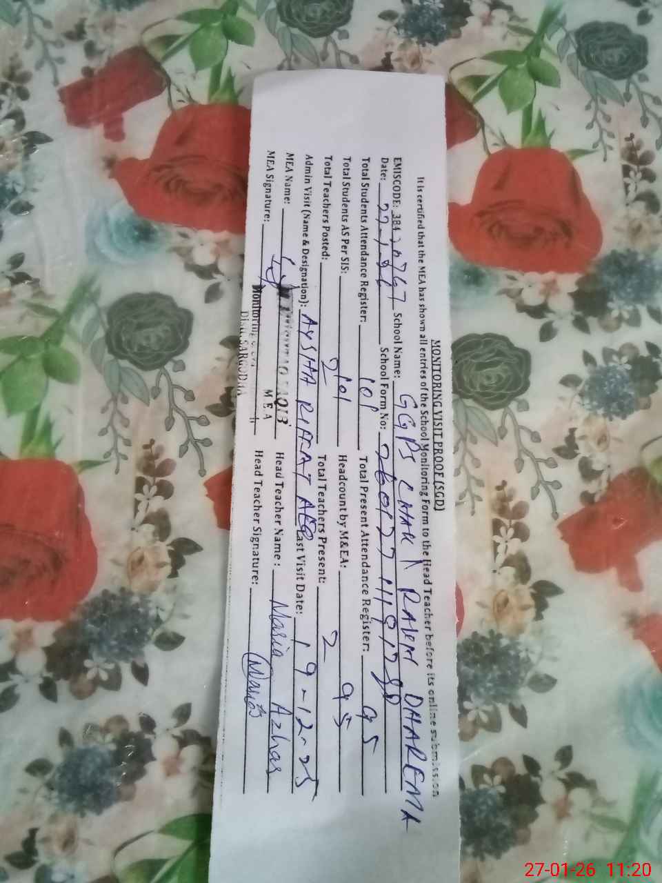 | Attendance Register | Head Teacher | MEA with School | Visit Proof |