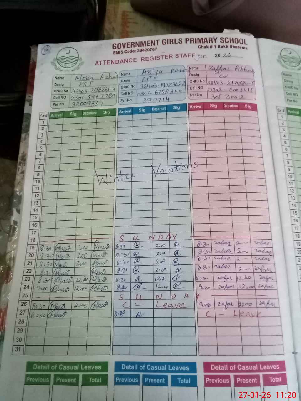 | CNIC | Full Name | Designation | R/C | Absence during last cal. month |