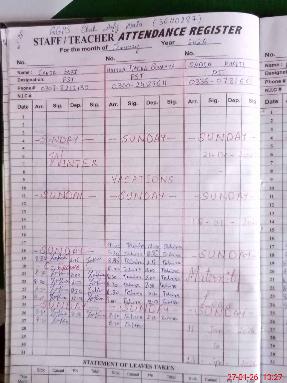 | 36**** | Sa**** Kh**** | PST Science/Maths | Regular | 0 | 0 | 0 | 0 | 0 | 0 | 0 | 0 | 0 | Maternity |