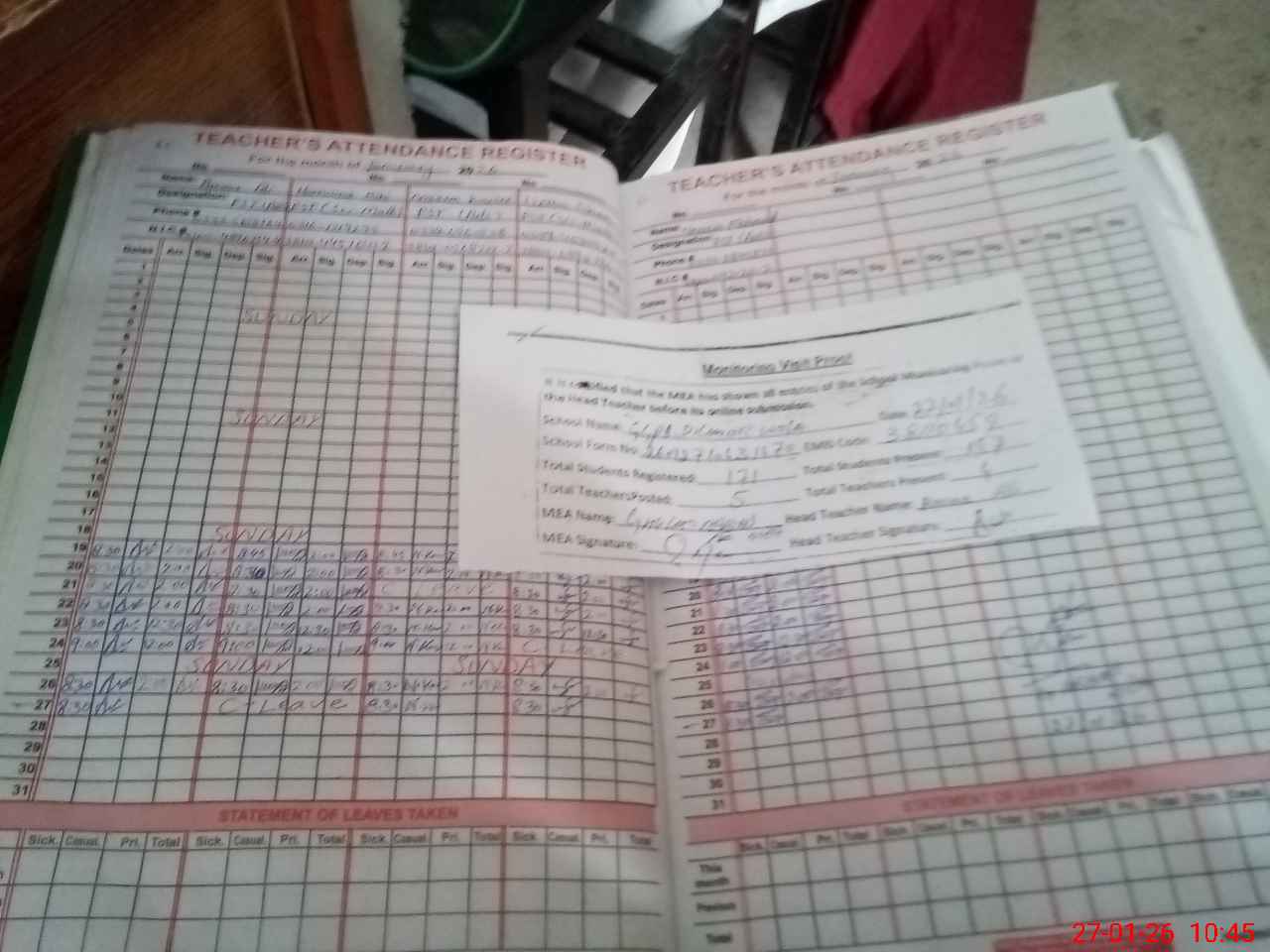 | Attendance Register | Head Teacher | MEA with School | Visit Proof |