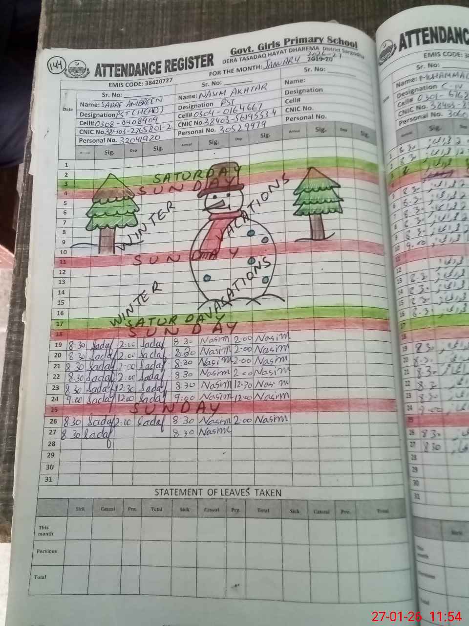 | CNIC | Full Name | Designation | R/C | Absence During Last Calender Month |