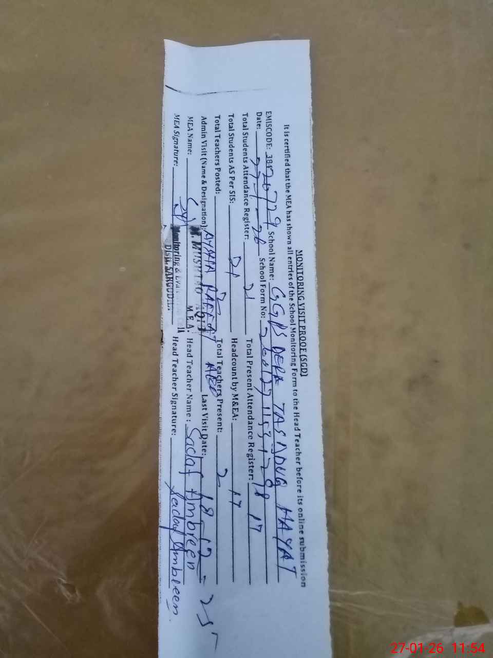 | Attendance Register | Head Teacher | MEA with School | Visit Proof |