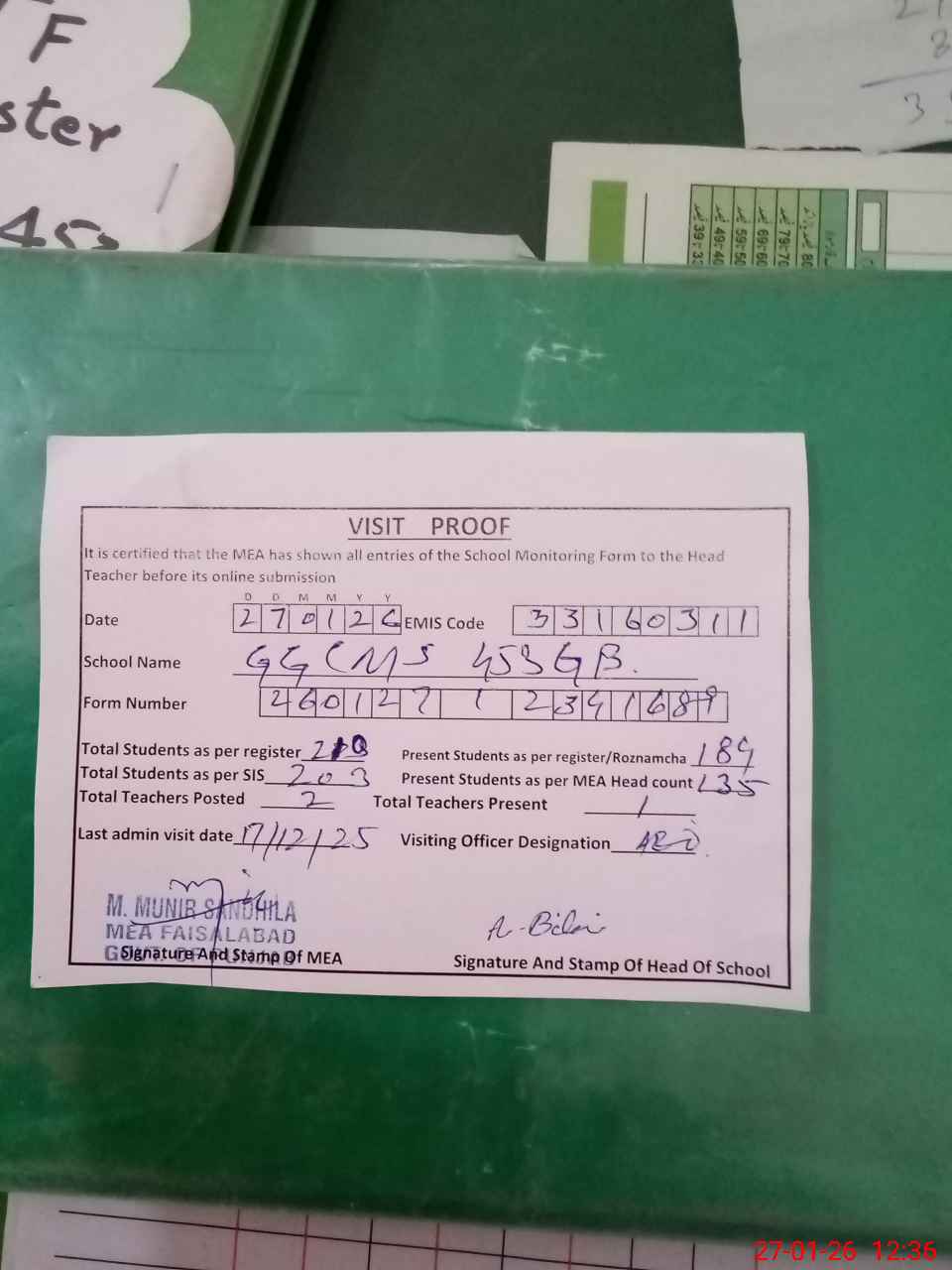 | Attendance Register | Head Teacher | MEA with School | Visit Proof |