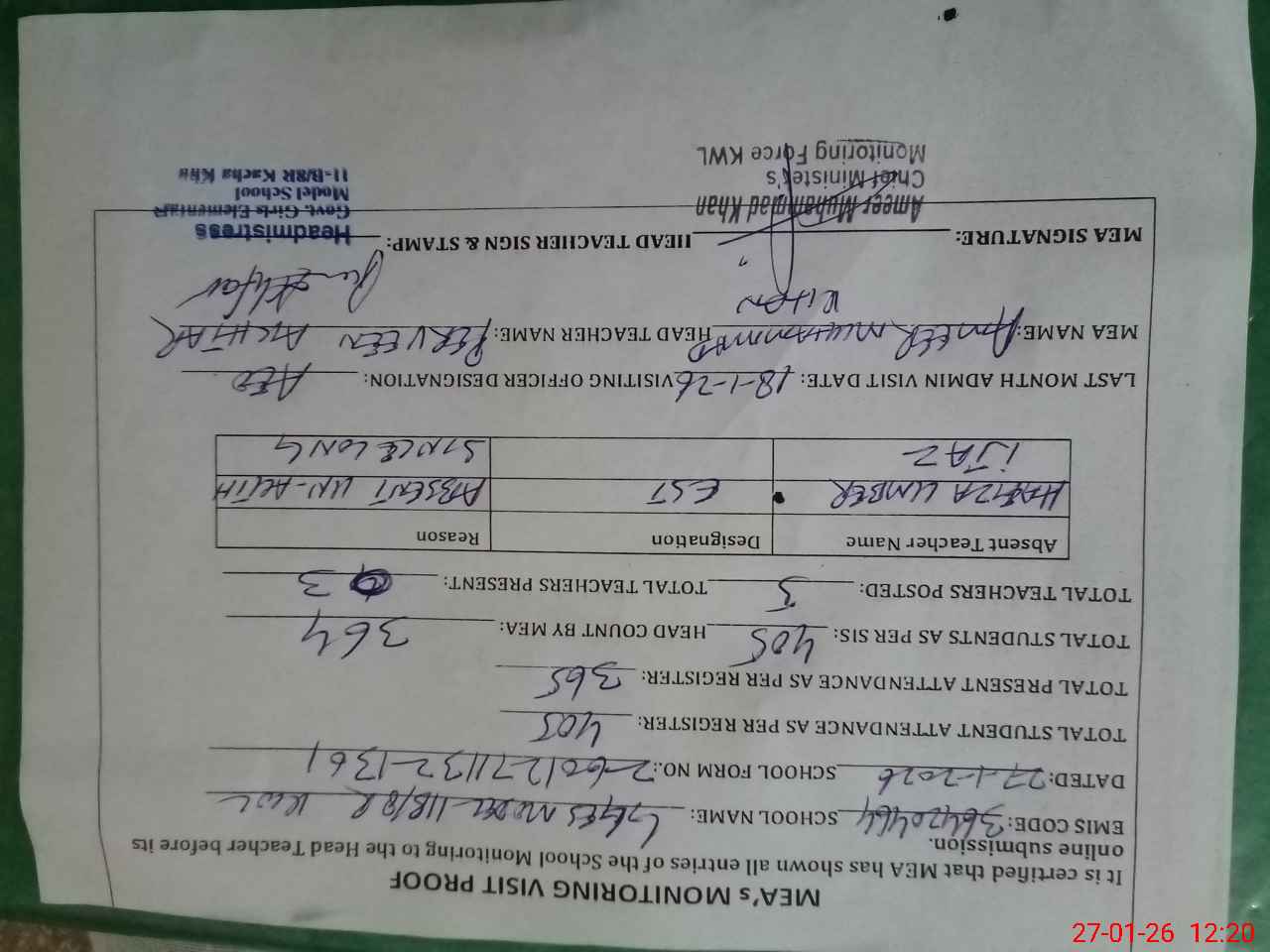 | Attendance Register | Head Teacher | MEA with School | Visit Proof |