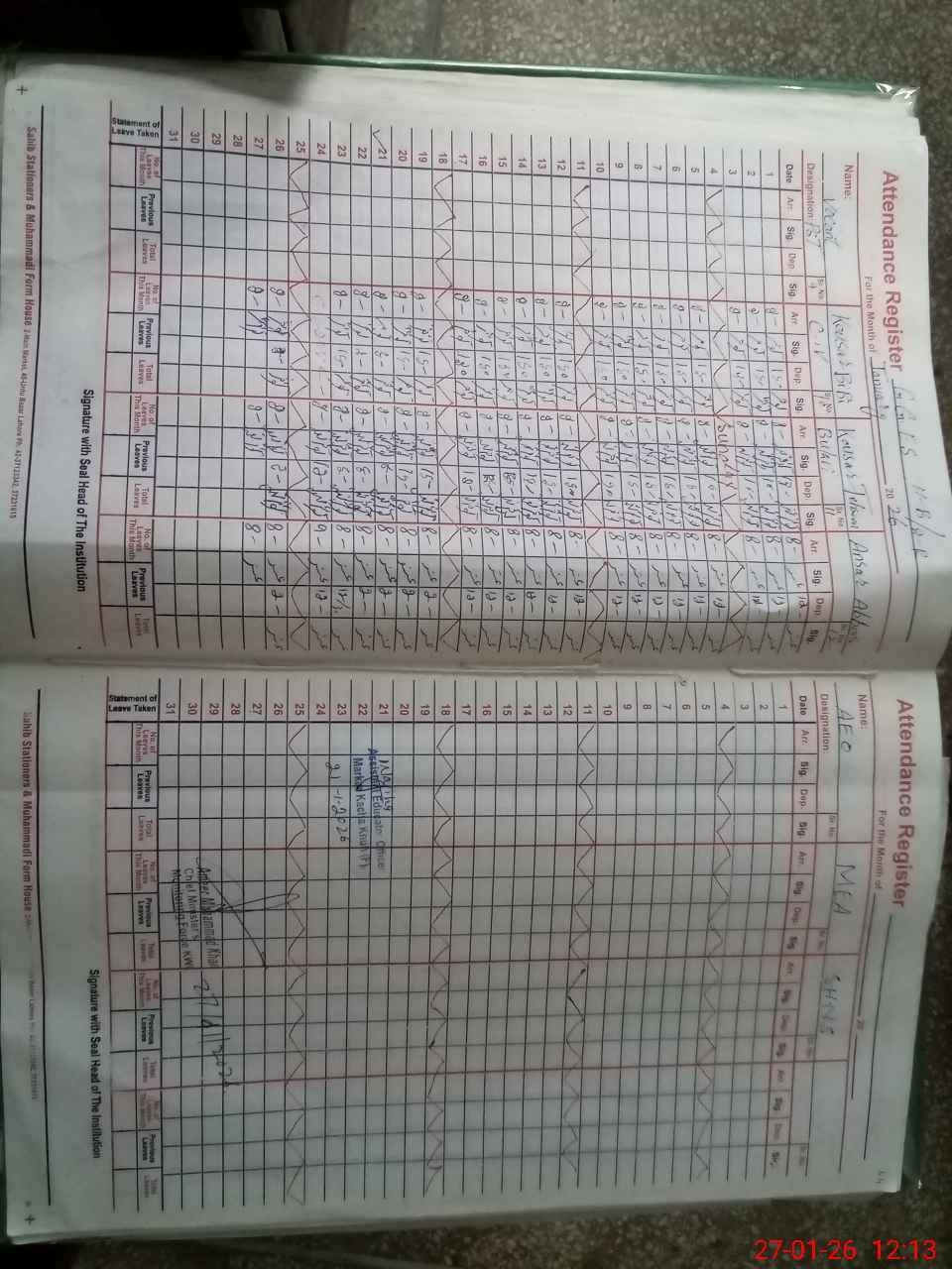 | CNIC | Full Name | Designation | R/C | Absence During Last Calender Month |