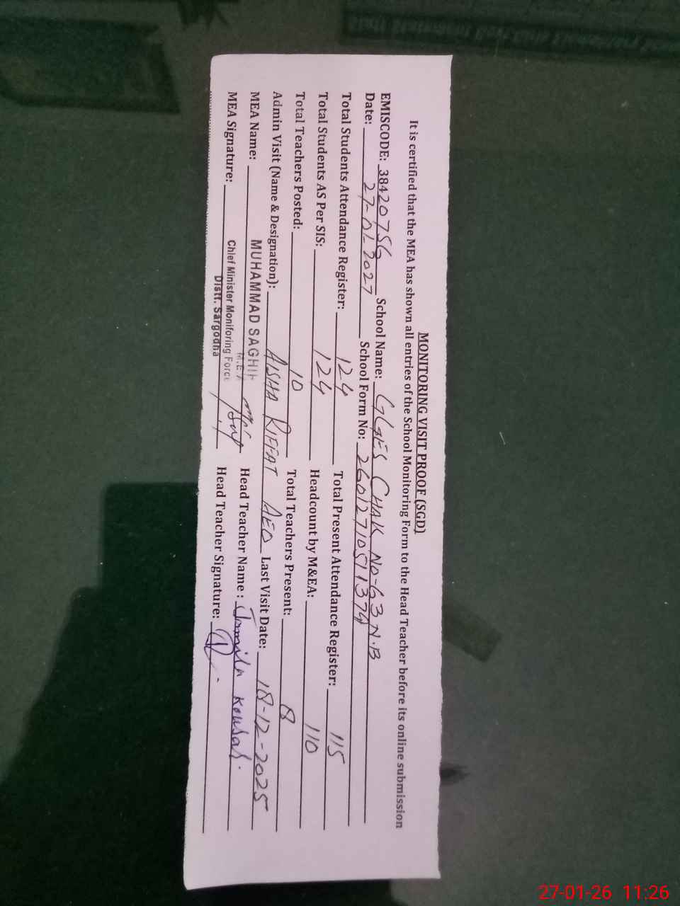 | EMIS Code: 38420756 | Name of School: GGES CHAK NO.63 NB | |||
