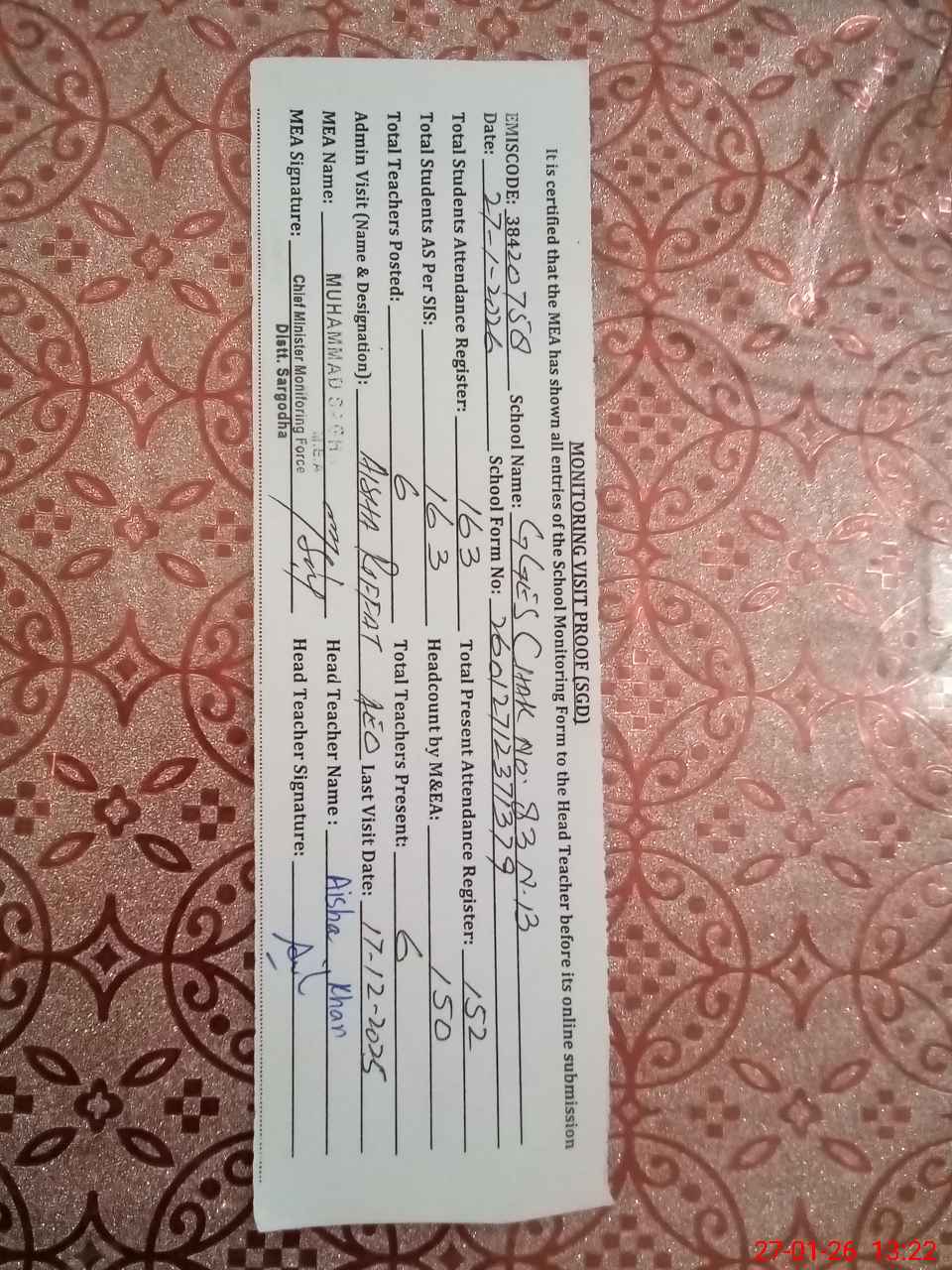 | Attendance Register | Head Teacher | MEA with School | Visit Proof |