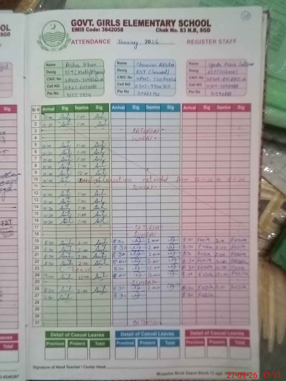 | Name: AI**** KH**** Designation: (School Headmaster's/Headmistress's) SST (PHY-MATH) Phone/Cell Number: 03**** |