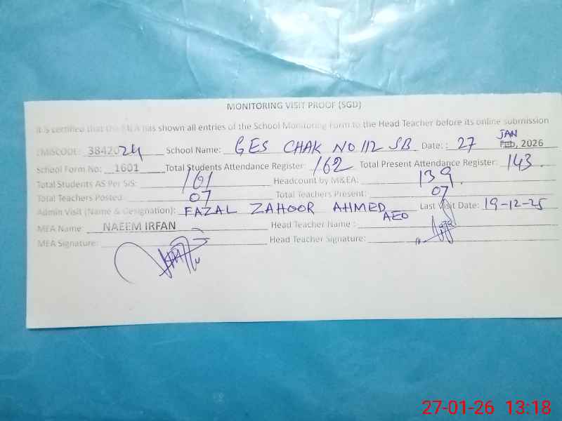 | EMIS Code: 38420241 | Name of School: GES CHAK NO.112 SB | |||