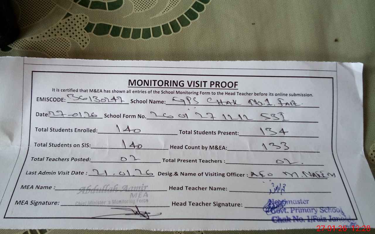 | EMIS Code: 36130247 | Name of School: GPS CHAK NO. 1 FAIZ SOUTH | |||